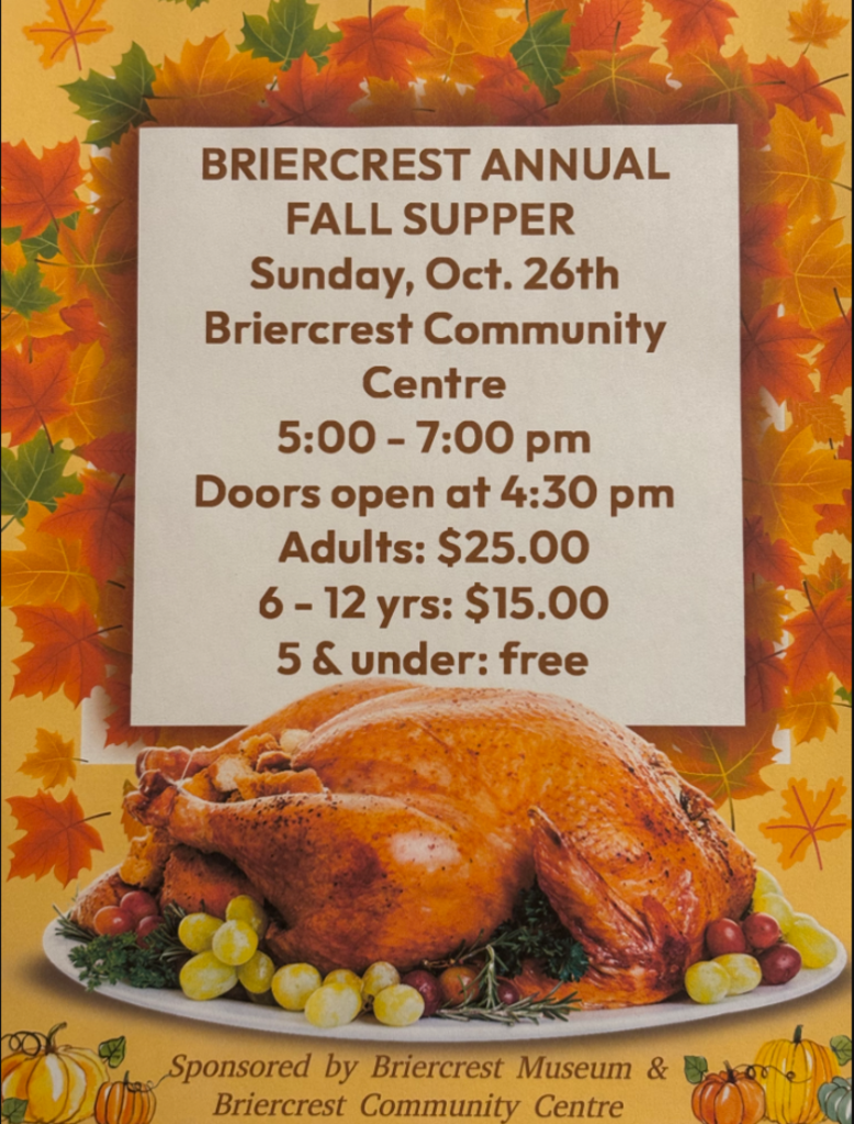 Briercrest Fall Supper will be held on Sunday, October 26th from 5:00-7:00 pm at the Briercrest Community Centre. Come and enjoy a homecooked meal of turkey, ham and all the trimmings. Adults:$25.00, 6-12 yrs:$15.00, 5 & under: free. Tickets available at the door, doors open at 4:30 pm. Sponsored by the Briercrest Museum & the Briercrest Community Centre. For more information contact Marge (306) 630-4092.