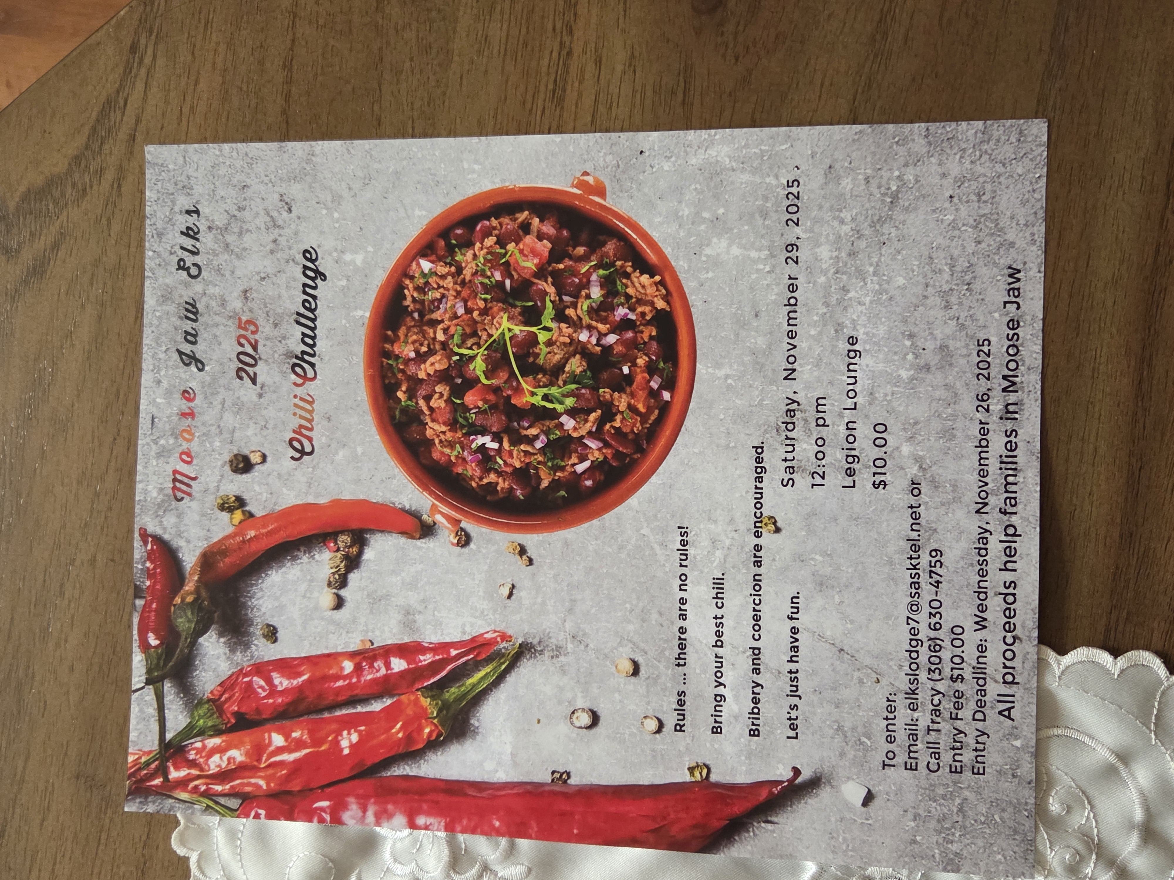 Moosejaw elks Chilli challenge on Saturday Nov 29 2025.10.00 entry to enter email elkslodge7@sasktel.net or call tracy @ 306-630-4759 Deadline to enter is November 26 .open to the public cost is 10.00 it is held at the legion lounge starting at 12.00 pm all proceeds help families in moosejaw