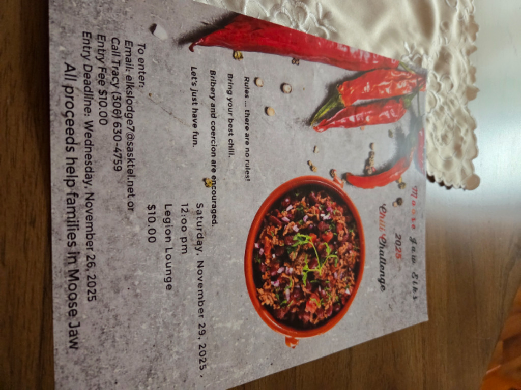 Moosejaw elks Chilli. Saturday November 29 2025 to enter email:elkslodge7@sasktel.net or call tracy @630-4759 entry fee 10.00 entry deadline Wednesday November 26