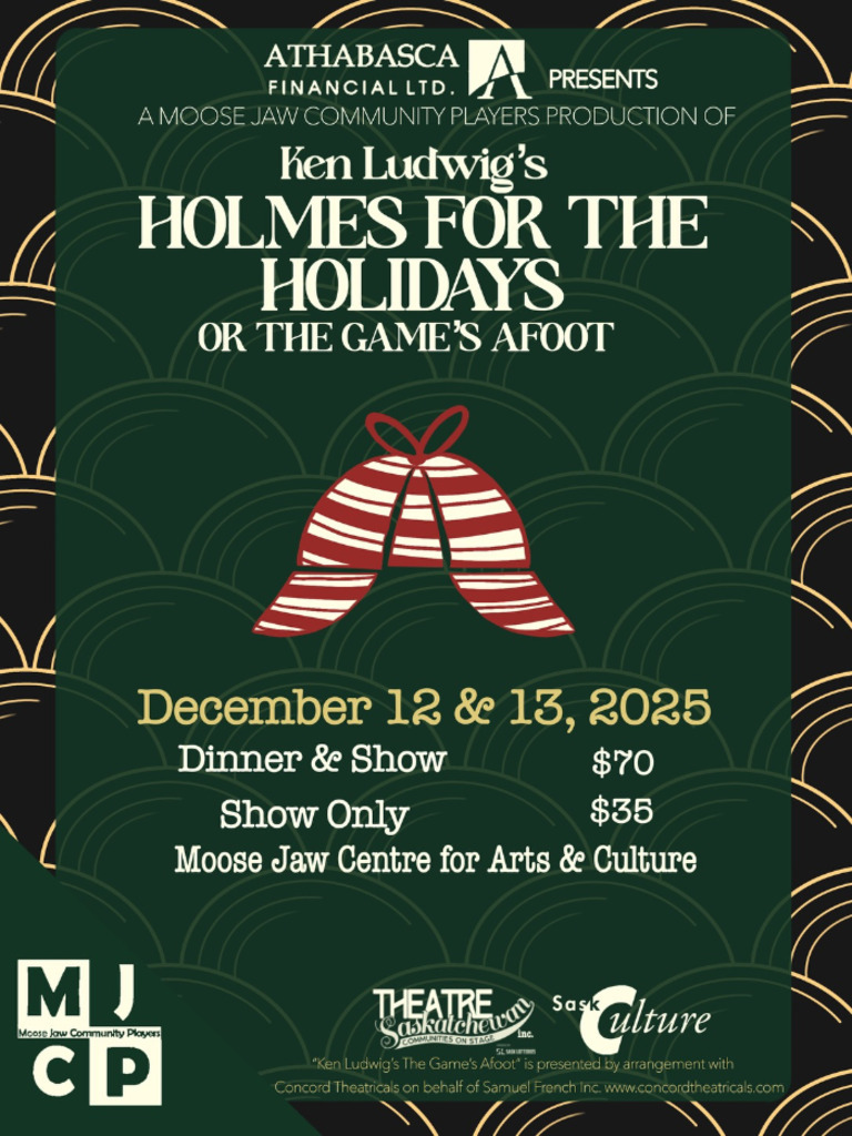 Experience an unforgettable evening of theatre this holiday season as the Moose Jaw Community Players proudly present Ken Ludwig's Holmes for the Holidays (or The Game's Afoot). This witty and fast-paced comedy blends the intrigue of Sherlock Holmes with clever humor and a festive twist, promising an evening of entertainment that will delight audiences.