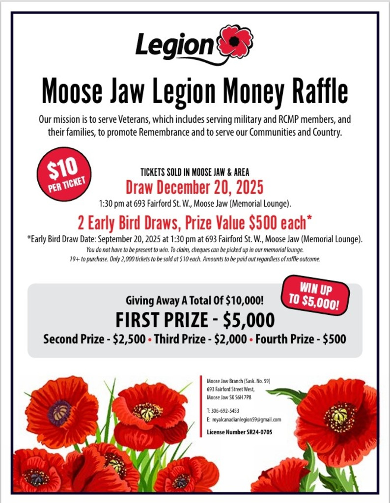 *Early Bird Draw Date: September 20, 2025 at 1:30 pm at 693 Fairford St. W., Moose Jaw (Memorial Lounge).