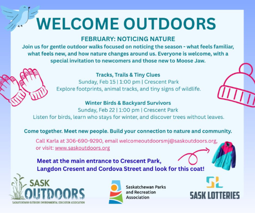 The Welcome Outdoors program will continue in Moose Jaw through the spring, with additional events planned from February through May in different outdoor spaces. Community members are encouraged to watch for more details as new sessions are announced.