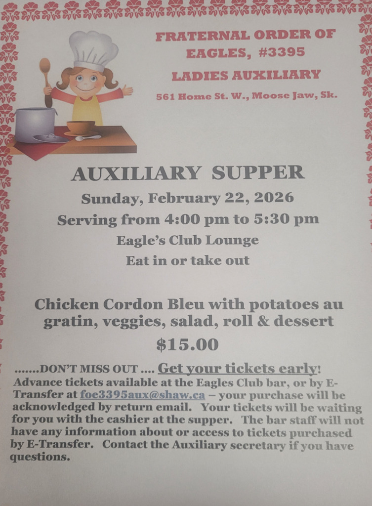 Sunday, February 22, 2026 - Serving from 4:00 pm to 5:30 - Cordon Bleu Supper with potatoes au gratin, veggies, salad, roll and dessert - $15.00. Limited amount of tickets available so don't miss out ..... GET YOUR TICKETS EARLY....Advance tickets can be purchased at the Eagles Club Bar or by E-transfer at foe3395aux@shaw.ca until Friday, February 20th -